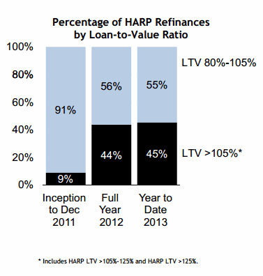 Borrowersrnwith LTV ratios greater than 105 percent accounted for 45 percent of the HARPrnloans in February and 22 percent had LTV ratios over 125 percent. The latter group of homeowners were notrneligible for the program before the LTV cap was eliminated by those 2011rnprogram revisions. </p