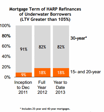 Another revision to the program created incentives forrnborrowers to refinance into shorter term mortgages in order to rebuild theirrnequity more quickly. In February 18rnpercent of HARP refinances were for shorter-term 15- and 20-year mortgages,rntwice the percentage as just before the program changes.</p