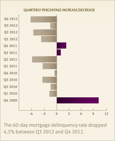 Thernfinal quarter of 2013 was the fourth consecutive one in which the 60+ day raterndeclined, dropping from 6.01 percent in Q4 2011 to 5.19 percent in Q4rn2012.  The rate was 5.41 percent at thernend of Q3 2012.  TransUnion expects the mortgage delinquency rate to continuernits downward trend in the first quarter of 2013, though it will likely remainrnabove 5%. </p