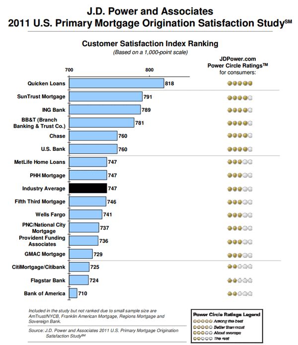 Quicken Loans led the list with 817rnpoints while Bank of America was at the bottom in customer satisfaction withrn696 points.  </p
