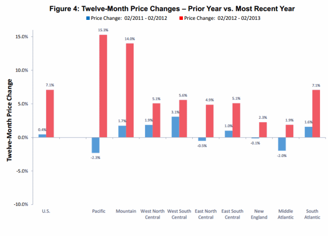 All divisions reported price increasesrnfor the previous 12 months but ranging from 1.9 percent in the Middle Atlanticrnto 14.0 percent in the Mountain division (Montana, Idaho, Wyoming, Nevada,rnUtah, Colorado, Arizona, New Mexico) and 15.3 percent in the Pacific regionrn(Hawaii, Alaska, Washington, Oregon, and California.)</p