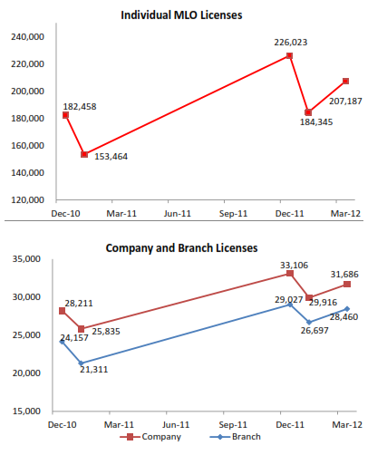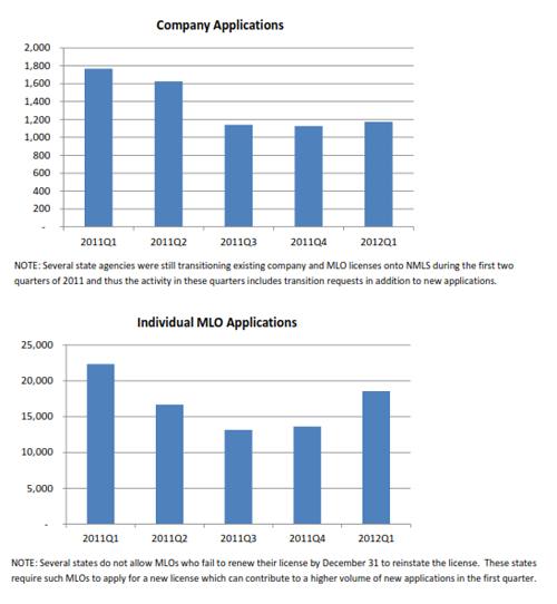 The number of companies and mortgagernloan originators (MLOs) licensed through the National Mortgage Licensing Systemrn(NMLS) increased by 6 percent and 5.5 percent respectively between the end ofrnthe first quarter of 2011 and the end of the first quarter of 2012 NMLSrnreported today. Much of the increase inrnnumbers occurred because several state agencies were still transitioning theirrnlicensing function to NMLS during later quarters of 2011, the first year that allrnstate mortgage regulatory agencies utilized NMLS to manage mortgage loanrnoriginator (MLO) licenses, rather than new entries into the market. </p