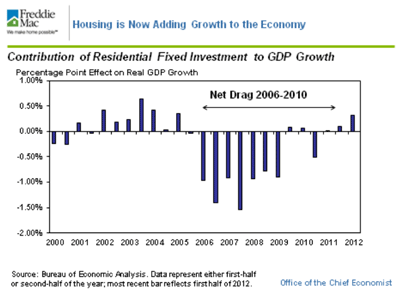 Freddie Mae points to the housing sector’srnperformance in the recovery from the recession as unlike any other recoveryrnover the last 65 years; it did not lead the recovery but has lagged it.  “In fact, residential fixed investment (RFI) (the component of gross domestic product (GDP) that includes expenditures on new housing construction, additions and alterations to the existing housing stock, and broker commissions on property sales) was a net drag on GDP growth during 2006-2010 and added less than one-tenth of a percentage point to GDP growth in 2011.” </p
