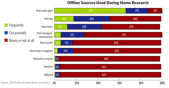 Agentsrnstill bridge the gap between internet research and viewing and buying arnhome. Eighty-eight percent of buyers usrnan agent and 67 percent do so frequently. Real estate consumers who use the internet while researching a home are more likelyrntornuse multiple sources such as newspapers, yard signs, andrnopen houses but these play a minimal role in decision making, so Realtors wouldrnbe wise to incorporate digital marketing into their offline efforts.</p