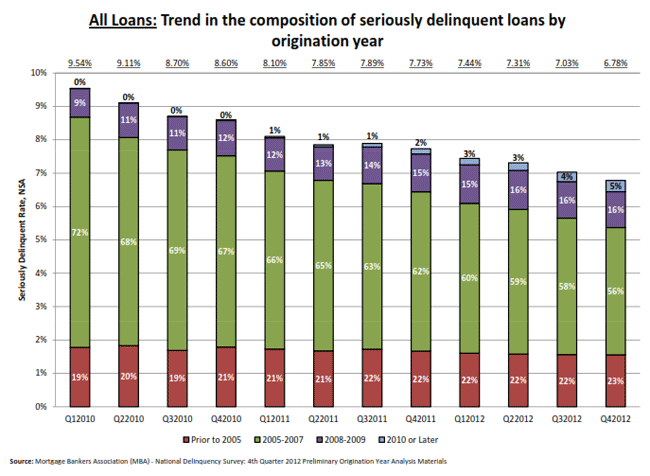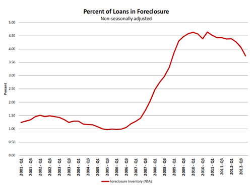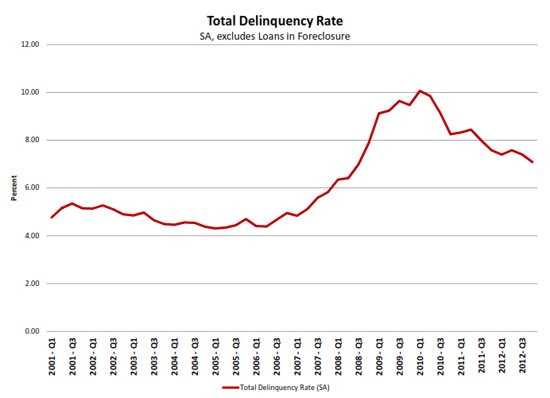 The delinquency rate includes loans that are at least one payment past due but does not include loans in the process of foreclosure. Foreclosure starts were at the lowest levelrnsince the second quarter of 2007, down 20 bps from Q3 to a rate of 0.70 percentrnand 29 bps lower than in the fourth quarter of 2011. The percentage of loans some stage of foreclosure at the end of the fourth quarter was 3.74 percent, down 33 bps from the third quarter, 64 bps lower than one year ago, andrnthe lowest level since the fourth quarter of 2008.</p