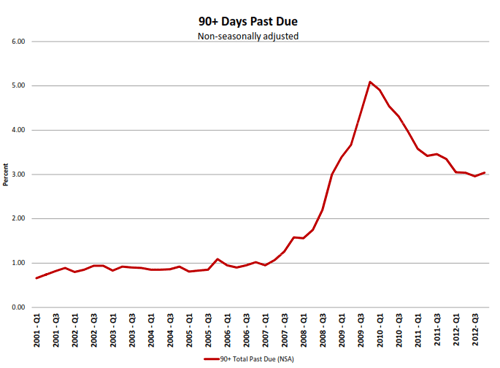 Mike Fratantoni,rnMBA’s Vice President for Research and Economics said at a press conferencernaccompanying release of the data that delinquency rates typically increase between the third and fourth quarters,rnpossibly due to increasing heating costs and holiday expenses, but thernnon-seasonally adjusted rate dropped 13 bps to 7.51 percent between the thirdrnand fourth quarters of 2012. Most of thernimproved delinquency numbers, he said, were driven by a drop in the 30+ dayrnrate which decreased 21 bps on an unadjusted basis. This rate, he said, is usually driven byrnimproved employment. The 30+ rate is atrnits lowest level since mid-2007.</p