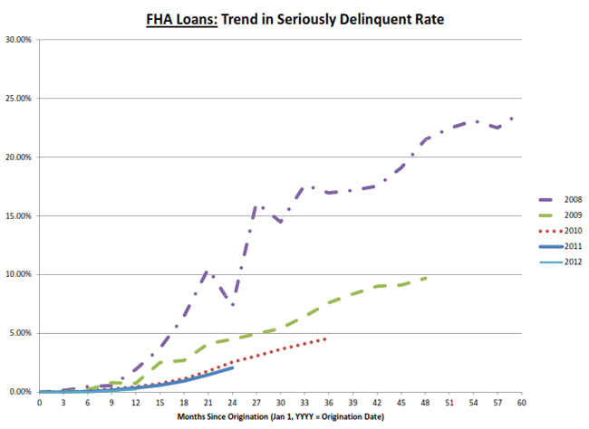 Brinkmann said the performance of FHA loans is mixed; foreclosure starts and inventory are down while the delinquency percentages generally remained flat or increased slightly,rnparticularly the percentage of loans 90 days or more past due. However, 44 percent of the FHA loans thatrnarernseriously delinquent were made in the years 2008 and 2009, while loans made in those yearsrnrepresent a smaller share of FHA’s overall book of business. He said that those currently evaluatingrnFHA’s performance could not accurately do so without looking at the data onrnthese recent loans.</p