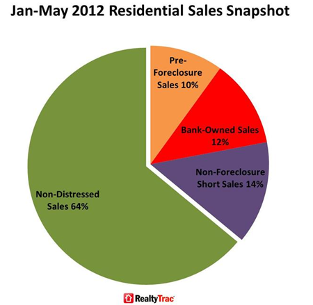 Foreclosed and pre-foreclosed homesrnmaintained their position as the source of over a fifth of U.S. home sales inrnthe second quarter of 2012. Twenty-threernpercent of all residential sales during the period were of bank-ownedrnproperties (REO) or homes in some stage of foreclosure, up from 22 percent inrnthe first quarter of the year and 19 percent in the second quarter of 2011. RealtyTrac, an Irvine, California firm thatrntracks foreclosure activity, reported that an additional 14 percent of allrnsales were short sales, where the bank agreed to a payoff lower than the actualrnoutstanding mortgage balance, that were unrelated to foreclosures.</p