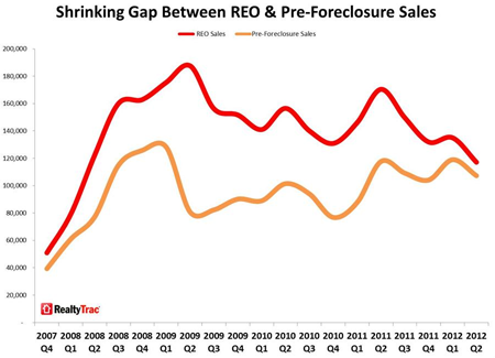 The number of pre-foreclosure salesrn(short sales) continued to rise relative to sales of REO. Foreclosure related short sales accounted forrn107,298 of the distressed sales during the quarter, only 9,733 fewer than bank-ownedrnproperty sales, the smallest difference between the two since 2007. Eleven percent of all sales during the secondrnquarter were pre-foreclosure sales, up from 8 percent in Q2 2011, and these outnumberedrnREO sales in 13 states and the District of Columbia. The 117,131 sales of REO represented 12rnpercent of all sales in the quarter, unchanged from Q1 and one point higherrnthan Q2 2011.</p