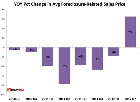 Bank-owned real estate sold for an averagernprice of $155,892, 6 percent higher than in the first quarter and 10 percentrnabove the price in the same quarter of 2011. rnThis represented an average discount of 37 percent unchanged from thernfirst quarter and slightly below the 38 percent discount a year earlier. Thernhighest discounts for distressed property sales were recorded in Texas (41.64rnpercent) and Massachusetts (40.12 percent).</p