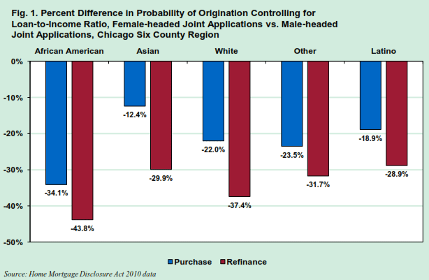 To control for those potentially confounding demographic factors, thernstudy ran an analysis on a subset of the datarnconsisting of joint applications with a male applicant with a female co-applicant or a femalernapplicant with a malernco-applicant.rnIn this subset, there werern21,432 purchase applicationsrnand 111,304 refinancernapplications.  Female-headedrnjoint applicationsrnoverall were 24rnpercent less likely to havernpurchase mortgages originated, and 39rnpercent less likely tornhave refinance mortgages originated, than were male-headed joint applications. Therndisparities applied across all racial categories with the largest found in African American female- headedrnjoint applications which werern34 percent lessrnlikely tornbe originated than were African American male-headed joint applications forrnpurchase and 44 percent lessrnlikely for refinancing. Latino female-headedrnjoint applicationsrnwere 19 percent lessrnlikely tornhave purchase mortgagesrnoriginated and 29rnpercent lessrnlikely tornhave refinance mortgagesrnoriginatedrnthan werernLatinornmale-headedrnjoint applications.</p