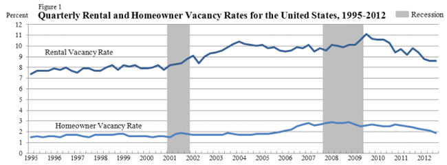 The vacancy rate for rental properties</bwas at 8.6 percent in the third quarter of 2012, unchanged from the secondrnquarter but down from 9.8 percent a year earlier.  Rental vacancies most recently peaked at 11.1rnpercent in the third quarter of 2009. </p